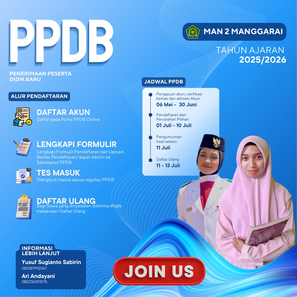 Pendaftaran Peserta Didik Baru (PPDB) MAN 2 Manggarai TA. 2025/2026 telah dibuka sampai tanggal 13 Juli 2025. Pendaftaran Online di : wwww.ppdb.man2manggarai.sch.id Pendaftaran Offline di : Jalan Bengan Cuncalawar Ruteng